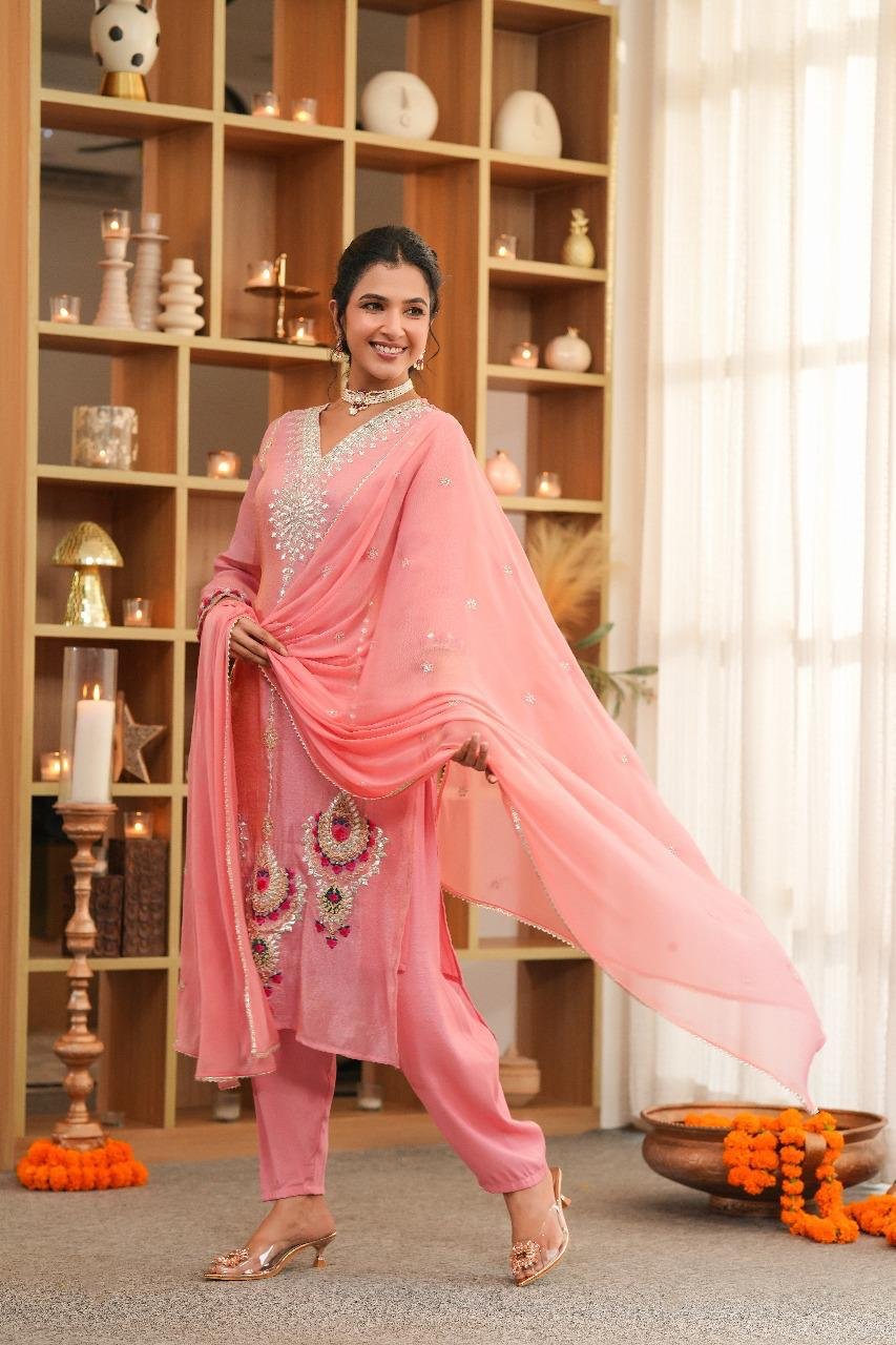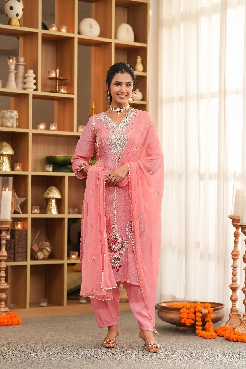 Rose Pink Suit with Heavy Silver Embellishment & Gota Border